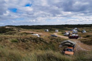 Gerade mit einem Allradfahrzeug können wir hier sehr schön am Rande der Dünen stehen. Tagsüber verlassen wir meist den Platz, um mit dem Van direkt an den Strand zu fahren. Dieser „Autostrand“ ist unmittelbar nahe dem Campingplatz, also eben über die Dünen. Zu laufen sind das gerade mal 10 Minuten.