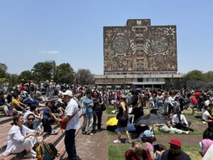 In Mexiko Stadt bedeckte der Monat ca. 80% der Sonne, was sich sehr schön durch entsprechend verdunkelte Scheiben oder Brillen gut zu sehen war. Auf dem Gelände der Universität hatten sich viele Tausend Menschen versammelt, um gemeinsam in den Himmel zu schauen und das besondere Schauspiel zu erleben.